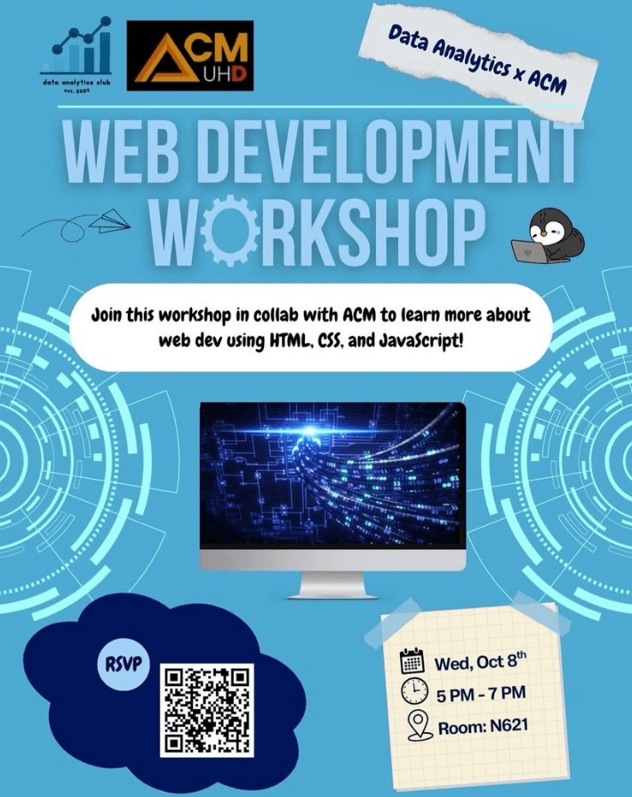 Join us for an engaging workshop in collaboration with ACM where you’ll dive into the fundamentals of web development. This hands-on session will introduce you to the core building blocks of the web—HTML, CSS, and JavaScript—and show you how they work together to create interactive and visually appealing websites. Whether you’re completely new to coding or looking to strengthen your skills, this workshop will provide a supportive environment to learn, practice, and ask questions. By the end, you’ll walk away with the knowledge to start building your own web projects and a clearer understanding of how modern websites are developed.